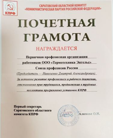 * Первичная профсоюзная организация работников ООО «Термотехника Энгельс» Союза профсоюзов России — Российский профсоюз металлистов. Председатель — Дмитрий Николенко.