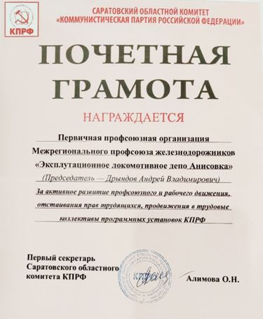 * Первичная профсоюзная организация Межрегионального профсоюза железнодорожников «Эксплуатационное локомотивное депо Анисовка». Председатель — Андрей Дрындов.