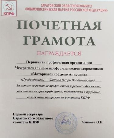Первый секретарь Саратовского обкома КПРФ, депутат Государственной Думы РФ Ольга Алимова вручила почётные грамоты трём первичным профсоюзным организациям региона, которые показали наиболее выдающиеся результаты в работе. Эти награды — признание заслуг профсоюзных лидеров и их команд в защите интересов трудящихся и развитии профсоюзного движения.