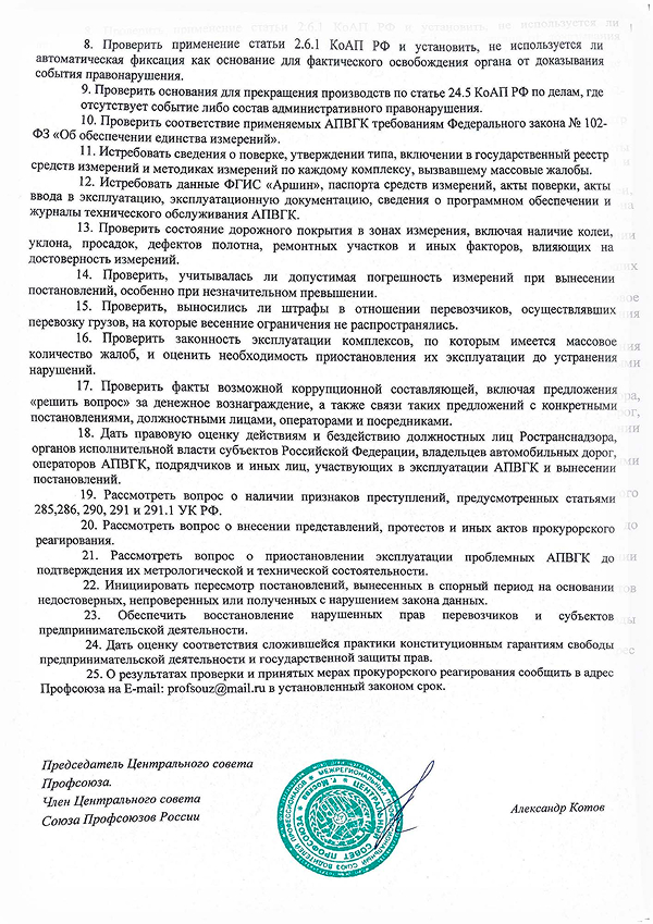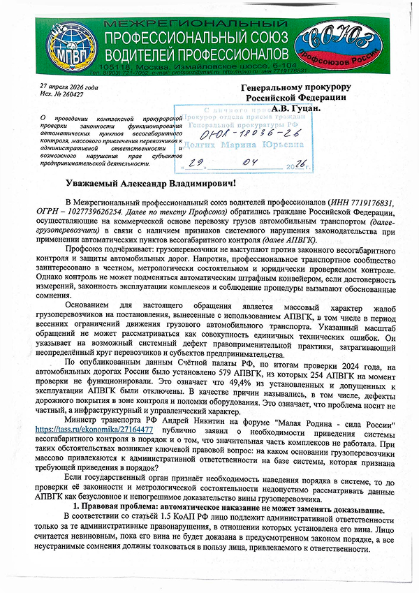 Профсоюз подчёркивает: грузоперевозчики не выступают против законного весогабаритного контроля и защиты автомобильных дорог. Напротив, профессиональное транспортное сообщество заинтересовано в честном, метрологически состоятельном и юридически проверяемом контроле. Однако контроль не может подменяться автоматическим штрафным конвейером, если достоверность измерений, законность эксплуатации комплексов и соблюдение процедуры вызывают обоснованные сомнения.