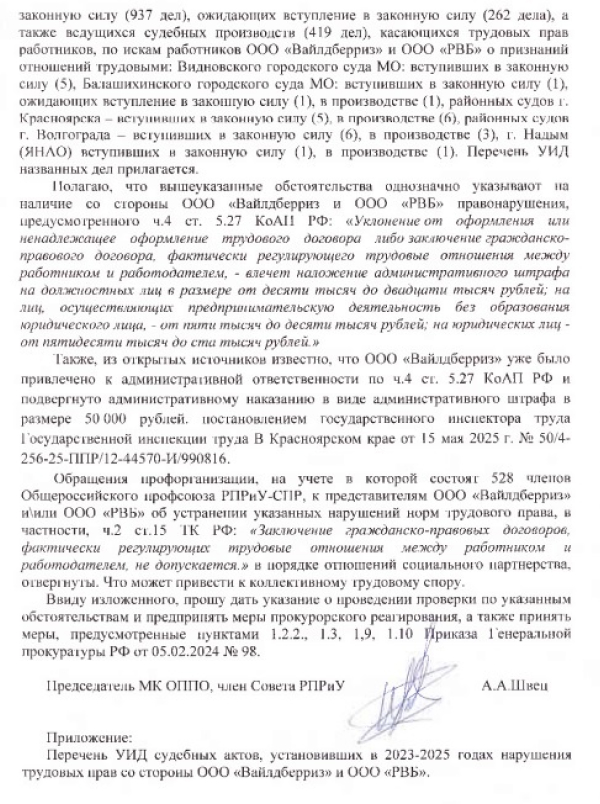 Как рассказал Александр Швец, реальная причина преследования - профсоюзная деятельность. Отметим, что более 1200 выигранных в суде исков против «Вайлдберриз» о переводе «исполнителей» по договорам ГПХ в трудовые договоры «кладовщиков», о признании производственными травм, полученных «исполнителями» по ГПХ на складах «Вайлдберриз», а также и выступления лидера профсоюза в Думе по проблеме платформенной занятости. Эта причина для недобросовестного работодателя быть недовольным и желать избавиться от председателя профорганизации любыми способами, не так ли?