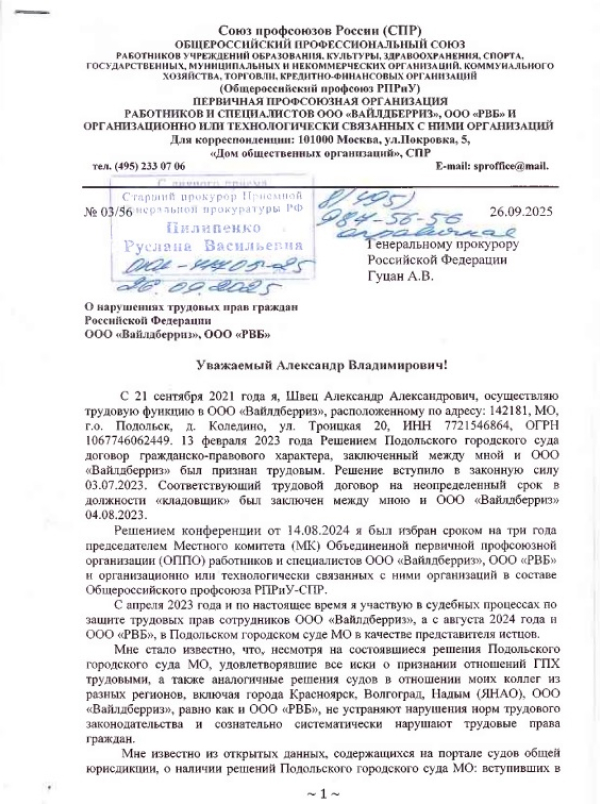 10 и 14 октября 2025 г. в Подольском городском суде прошли заседания по уголовному делу, заведённому на лидера профсоюза Александра Александровича Швец (председатель первички РПРиУ-СПР работников и специалистов ООО «Вайлдберриз», ООО «РВБ»). Дело возбуждено по ч. 1 ст. 303 УК РФ и ч.1 ст.159 УК РФ.